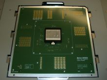 Der Testsockel ist mit einem Kühlkörper versehen, um die Abwärme des Bausteins abzuführen. Die HF-Signale im GHz-Bereich werden von unten an das Testboard zugeführt. Das Test Board selbst ist impedanzkontrolliert und besteht aus 10 Lagen.
