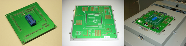 Dazu wird das Test Board in zwei Teilen realisiert. Das Motherboard ist Testsystem-spezifisch und enthält auf seiner Unterseite die Kontaktflächen für die Verbindung zum Testsystem. Auf der Oberseite befinden sich Reihen von Steckverbindern, auf denen eine Daughtercard aufgesteckt wird.